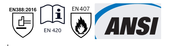 Complies with the requirements of CE type examinations EN 388-2016 EN 42021 for tanning chemical material leather ph , sizing, tear resistance, puncher resistance, abrasion resistance EN407 for thermal heat and fire flame, Ansi cut resistance, ansi puncture resistance, ansi tear resistance, ansi abrasion resistance, ANSI/ISEA 138-2 and ansi heat resistance