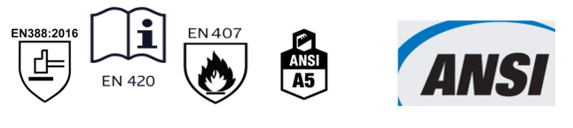 Complies with the requirements of CE type examinations EN 388-2016 EN 42021 for tanning chemical material leather ph , sizing, tear resistance, puncher resistance, abrasion resistance EN407 for thermal heat and fire flame, Ansi cut resistance, ansi puncture resistance, ansi tear resistance, ansi abrasion resistance, ANSI/ISEA 138-2 and ansi heat resistance